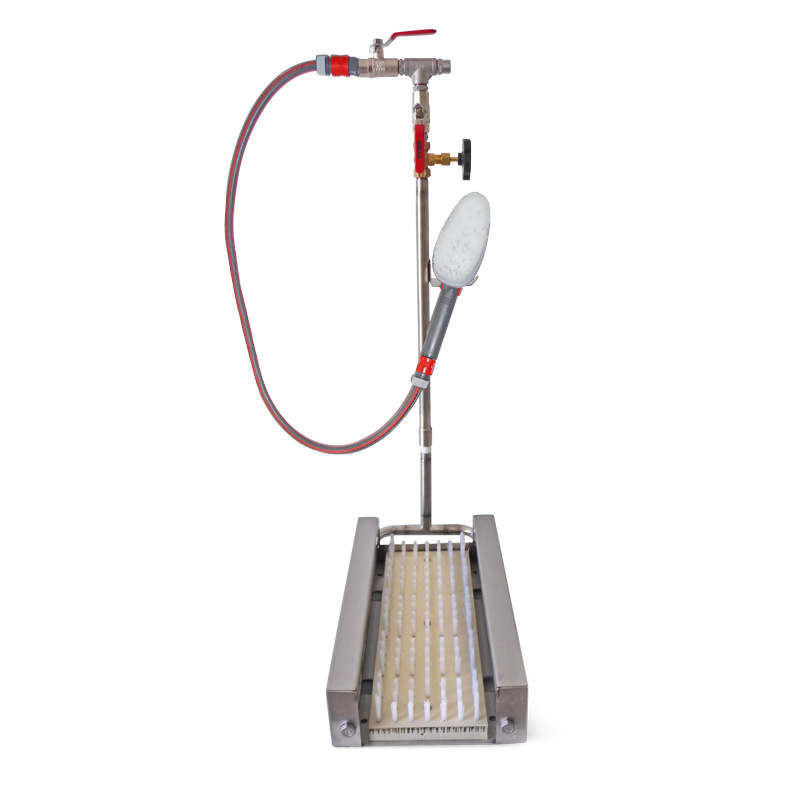 Gegen Aufpreis kann die Standard-Handwaschbürste aus Kunststoff durch eine äusserst professionelle Handwaschbürste aus Edelstahl mit Nylonborsten, Handhebelschnellschlussventil und einem robusten Panzerschlauch aus Drahtgeflecht ersetzt werden (siehe Optionen):