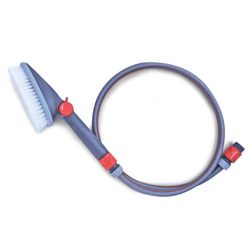 Die wasserführende Handbürste aus Kunststoff ermöglicht eine bequeme, schnelle und vor allem gründliche Reinigung von Arbeitsschuhen und Stiefeln. Der Wasserfluss wird über den stufenlosen Durchflussregler ausgelöst. Das aus der Bürste tretende Wasser löst Staub, Schlamm, Dreck und andere Anhaftungen auf und spült sie von den Schuhen und Stiefeln. Die Kombination aus fliessendem Wasser und dem Reiben der harten Kunststoffborsten entfernt in kürzester Zeit sämtliche Verunreinigungen von der Fussbekleidung. Mit dem mitgelieferten 1.5 Meter langen Schlauch ist für eine hohe Reichweite gesorgt. Zudem sorgt der flache und leichte Bürstenkörper dafür, dass auch schwer erreichbare Stellen bequem gesäubert werden können.