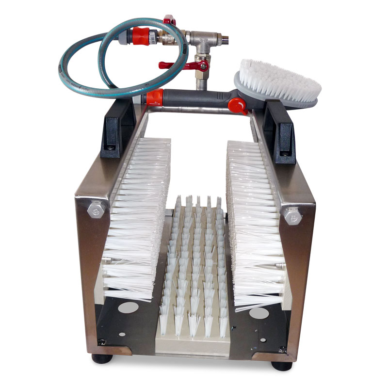 Standardausführung: Kunststoff-Handbürste mit Wasserschlauch für die manuelle Reinigung der Stiefelschäfte