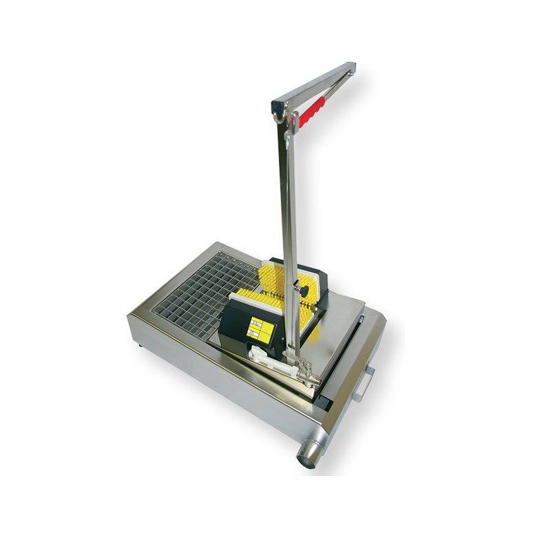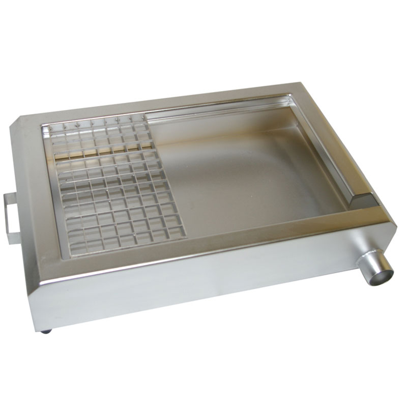 Diese Edelstahl-Auffangwanne besteht aus einem Gitterrost, wo grober Schmutz abgestreift werden kann und wodurch Flüssigkeiten ablaufen können, sowie einer ausgesparten Öffnung, in die sich die folgenden Reinigungsanlagen mühelos und ohne Werkzeug einsetzten lassen: