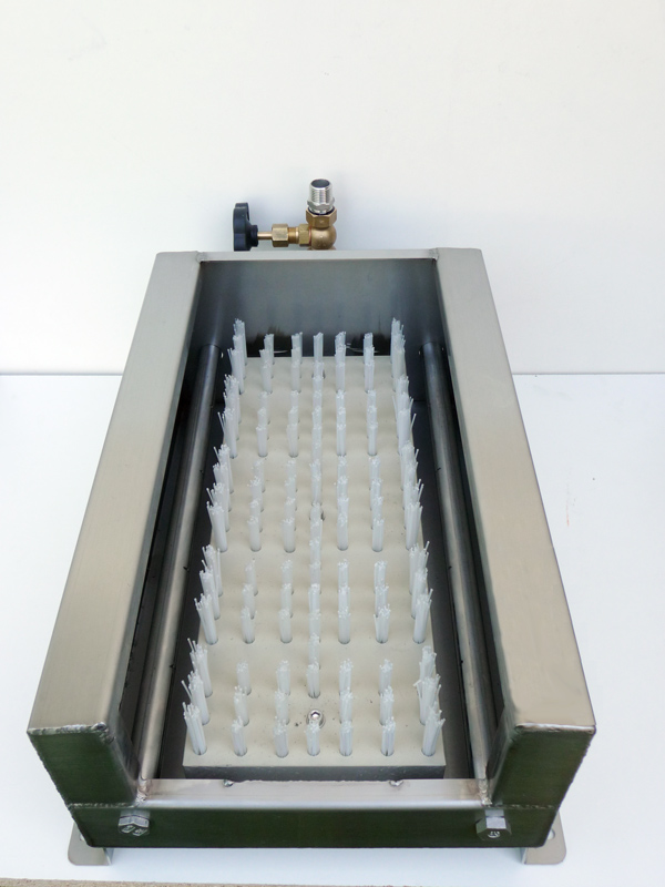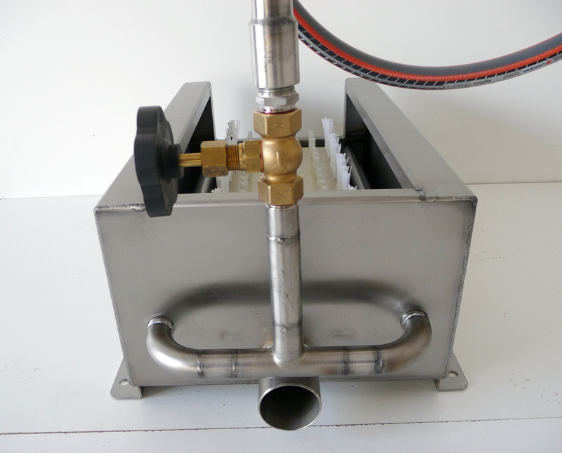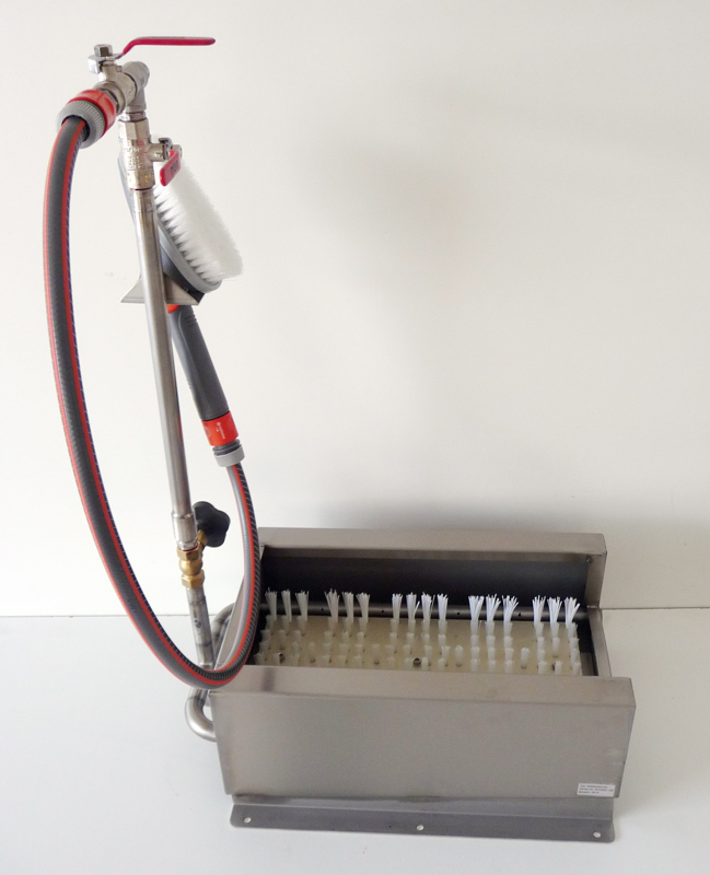 Diese Schuhwaschanlage ist aus hochwertigem, 2mm dickem Edelstahlblech 1.4301 gefertigt. Mit seiner breiten Sohlenreinigungsbürsten, welche auf den Seiten mit höheren Borsten ausgestattet ist, reinigt dieser Schuhreiniger verschmutzte Arbeitsschuhe schnell und zuverlässig. Dank der beiden schwenkbaren, extra tief montierten Sprühleisten kann die Wasserspritzhöhe individuell an das gerade getragene Schuhwerk angepasst werden. Zusätzlichen Spritzschutz bietet das Ventil mit welchem die Wassermenge reguliert werden kann. Für das Reinigen schwer erreichbarer Stellen ist die Schuhwaschanlage mit einer wasserführenden Handwaschbürste ausgestattet. Das verbrauchte Wasser wird in einer Edelstahlwanne gesammelt und über den hinten angebrachten Abfluss abgeleitet.