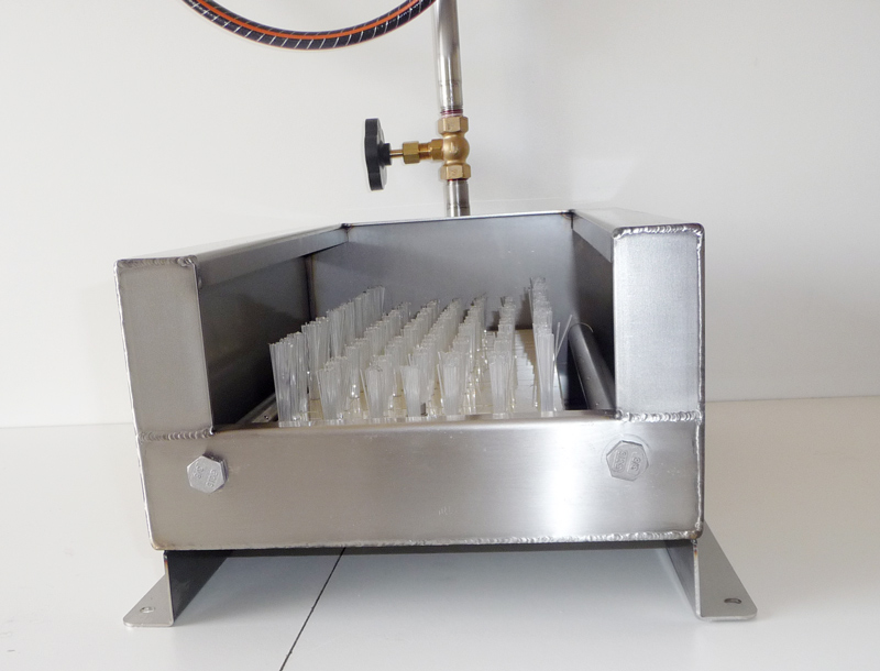 Gegen Aufpreis kann die Standard-Handwaschbürste aus Kunststoff durch eine professionelle Handwaschbürste aus Edelstahl mit Nylonborsten, Handhebelschnellschlussventil und einem robusten Panzerschlauch aus Drahtgeflecht ersetzt werden (siehe Optionen):