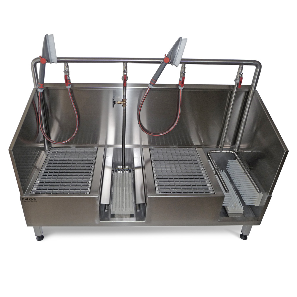 Beide Reinigungsplätze sind mit einem höher gelegenen, herausnehmbaren Gitterrost als Auftrittsfläche für die manuelle Reinigung der Stiefelschäfte und des Oberleders der Arbeitsschuhe ausgestattet. Mit einer der beiden im Lieferumfang enthaltenen wasserführenden Handwaschbürsten können die Stiefel und Arbeitsschuhe von sämtlichen Verschmutzungen befreit werden. Natürlich lassen sich mit der Handwaschbürste auch andere Ausrüstungsgegenstände nass reinigen.