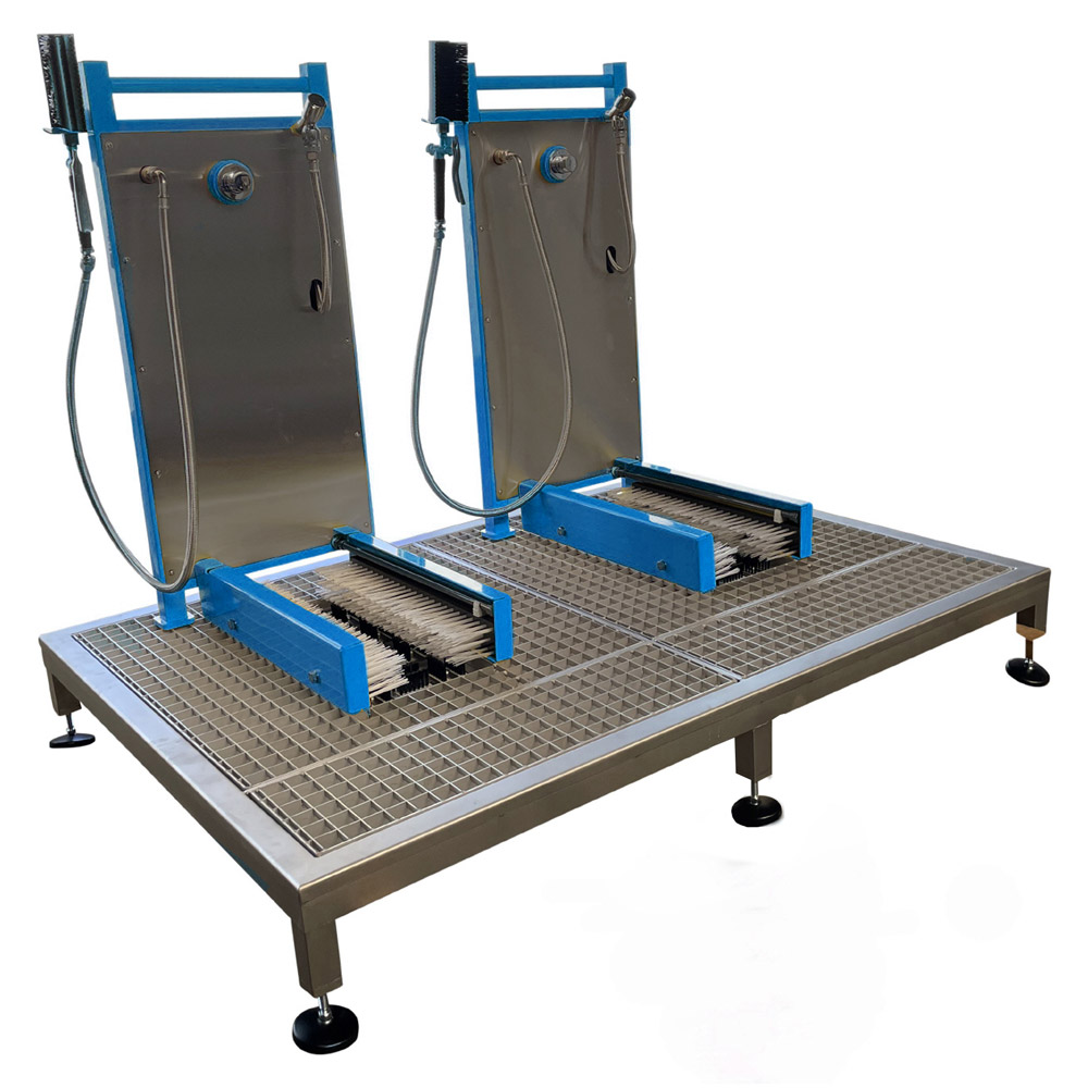 Die Stiefelwaschanlage Edelstahl Aufbauversion wird vollständig über dem vorhandenen Boden installiert und eignet sich ideal für Situationen, in denen eine Einbauinstallation nicht möglich ist. Je nach Bedarf ist die Anlage mit 1 oder 2 Reinigungsplätzen erhältlich (siehe Optionen). Nach dem Anschluss an die Wasser- und Abwasserleitung ist die Anlage unmittelbar betriebsbereit.