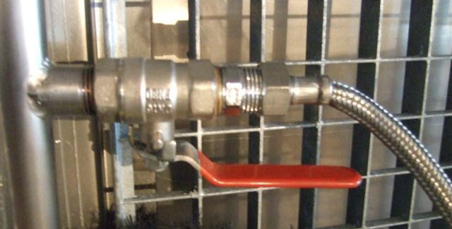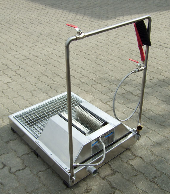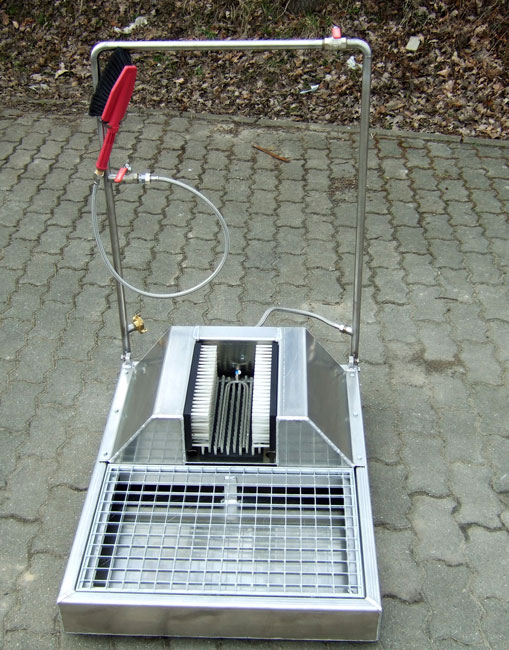 Das verbrauchte Schmutzwasser wird anschliessend in der grosszügigen Auffangwanne aus Aluminium aufgefangen und über ein Abflussrohr auf der Rückseite der Schuhwaschanlage abgeleitet. Der Wasseranschluss erfolgt über eine genormte ¾ Zoll Wasser GEKA Schnell-Kupplung. Für die schnelle und einfache Reinigung und Wartung der Stiefelwaschmaschine lässt sich der Gitterrost leicht entfernen.